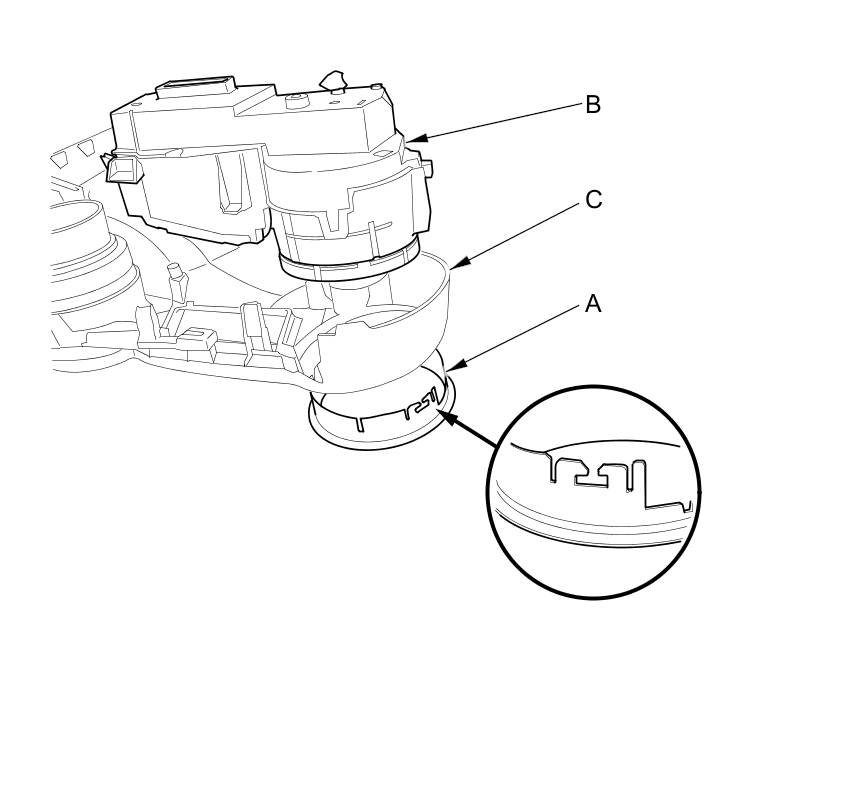 4. Remove the ring cover (A), and detach the climate control unit (B) from the instrument panel (C).
