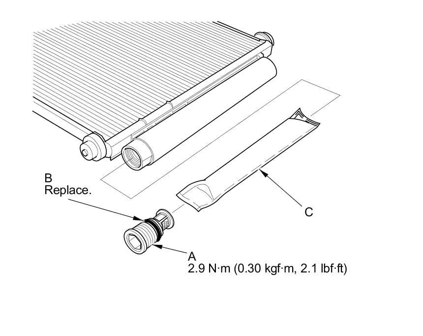 2. Remove the cap (A) from the bottom of the A/C condenser. Remove the O-ring (B) and the desiccant (C).