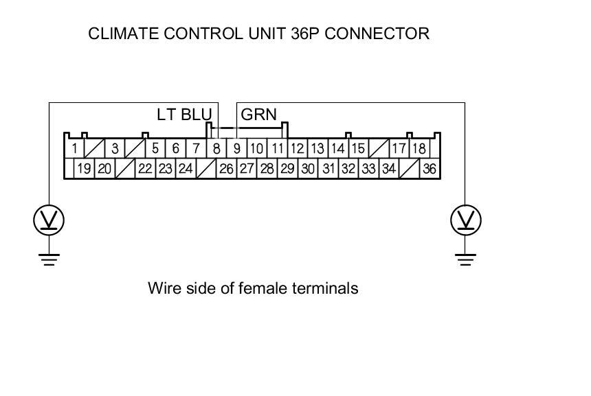 10. Measure the voltage between body ground and climate control unit 36P connector terminals No. 8 and No. 9 individually.