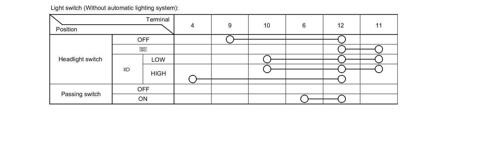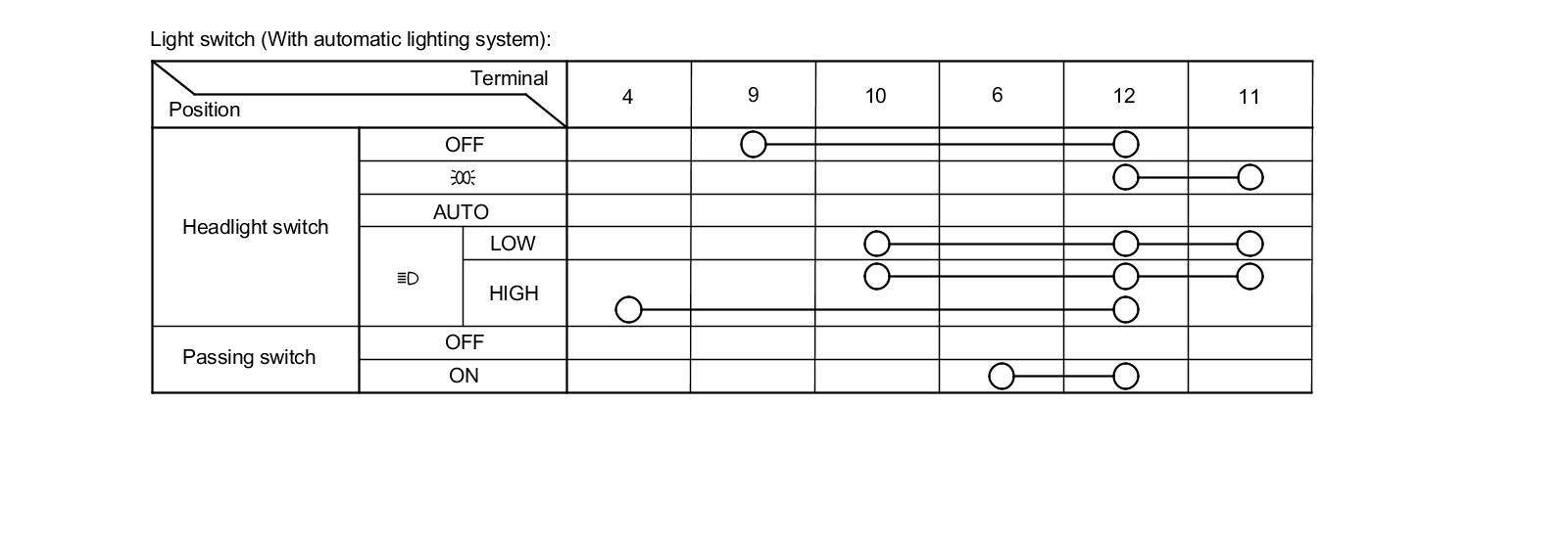 - If the terminals look OK, check for continuity between the terminals in each switch position according to the tables.