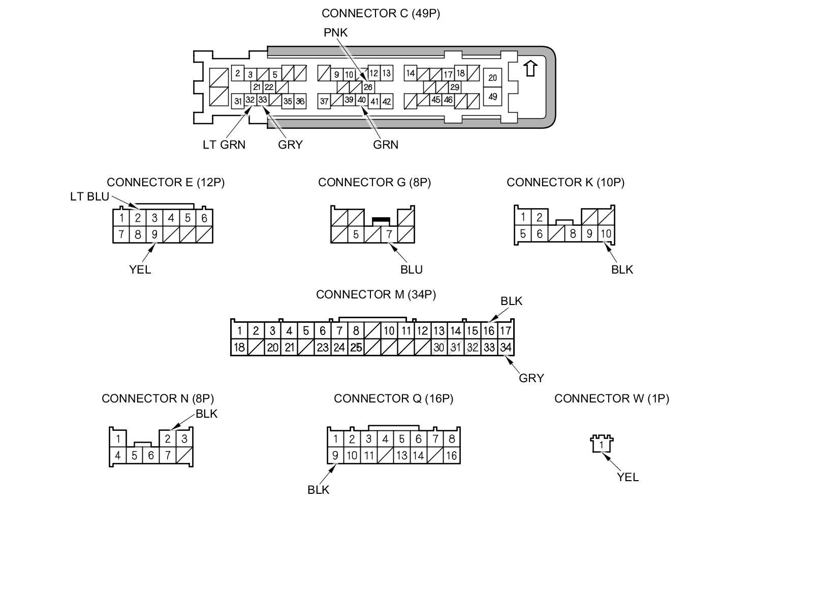 3. Disconnect the under-dash fuse/relay box connectors C, E, G, K, M, N, Q, and W.