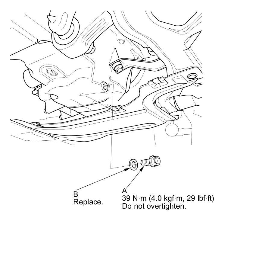 4. Reinstall the drain bolt with a new washer (B) and torque to specification.