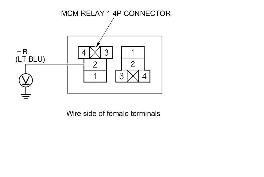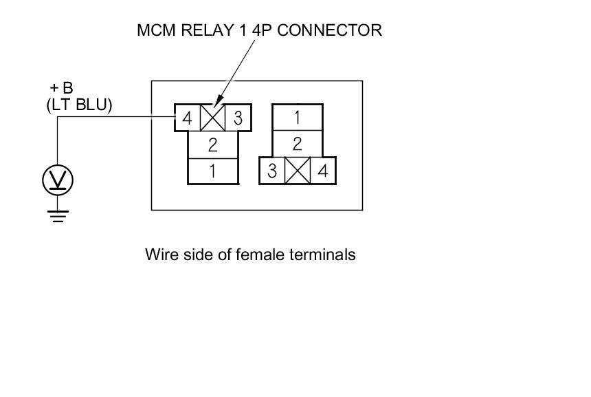 14. Measure the voltage between MCM relay 1 4P connector terminal No. 2 and body ground.