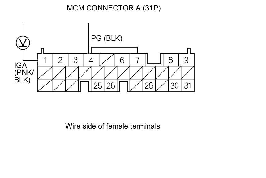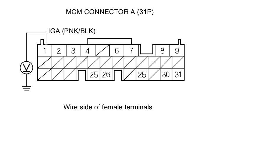 24. Measure the voltage between MCM connector terminal No. 1 and body ground.