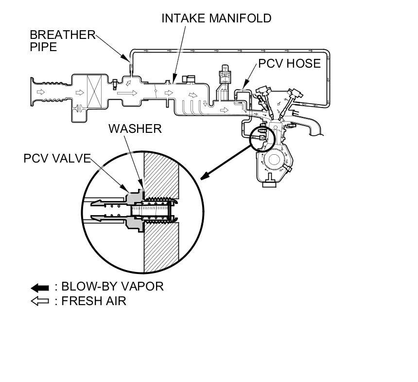 The PCV valve prevents blow-by gases from escaping into the atmosphere by venting them into the intake manifold.