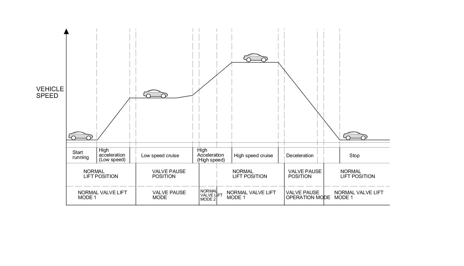 The engine runs on the normal lift cam. During an uphill run or an abrupt acceleration, the engine runs on normal valve lift mode 2 for about 2 seconds to check the VTEC system, then it returns to normal valve lift mode 1.