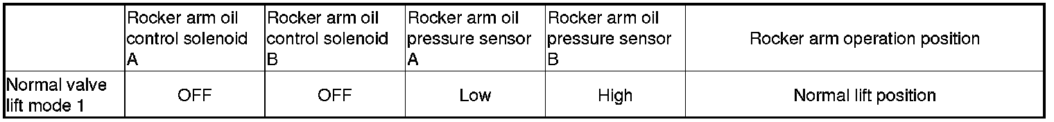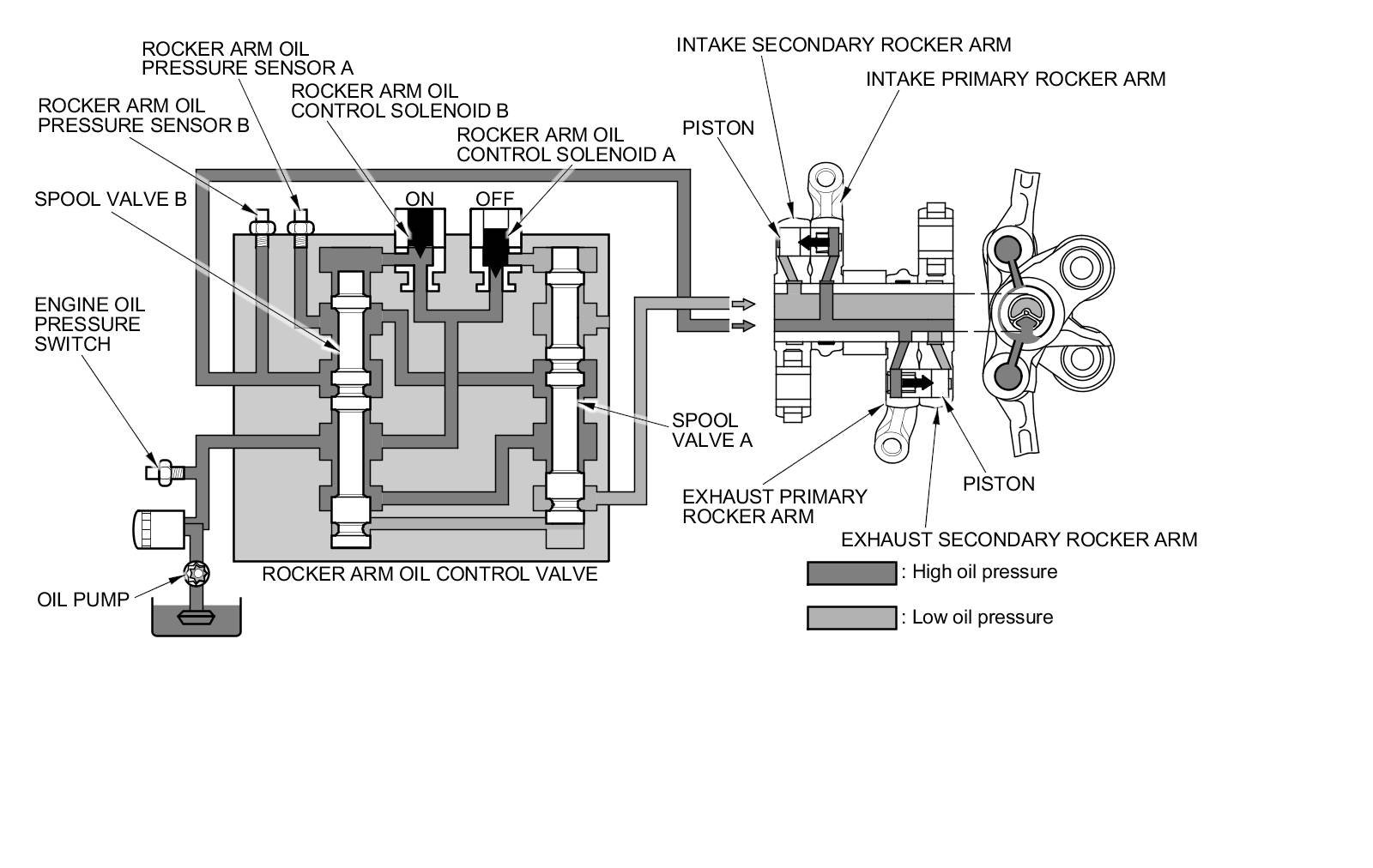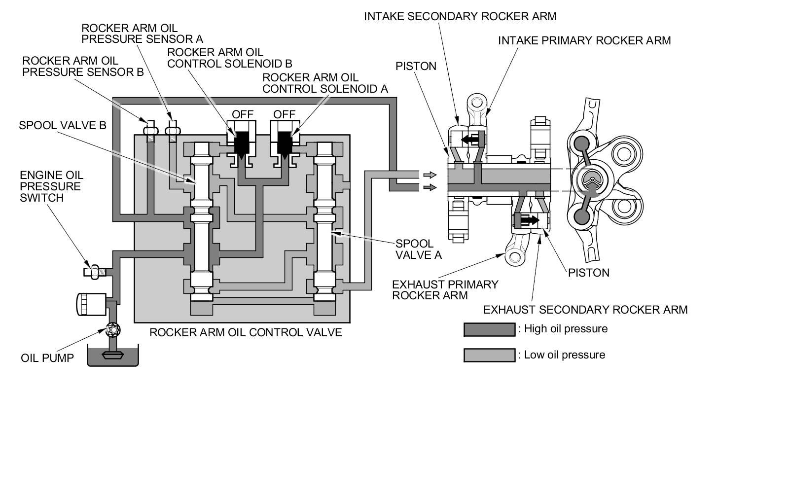 Rocker arm oil control solenoids A and B are both off. Engine oil pressure from the oil pump passes the spool valve and the rocker arm. Engine oil pressure is applied to the intake side pistons and the exhaust side pistons. This causes the primary and secondary rocker arms to shift the valves to their normal lift positions.