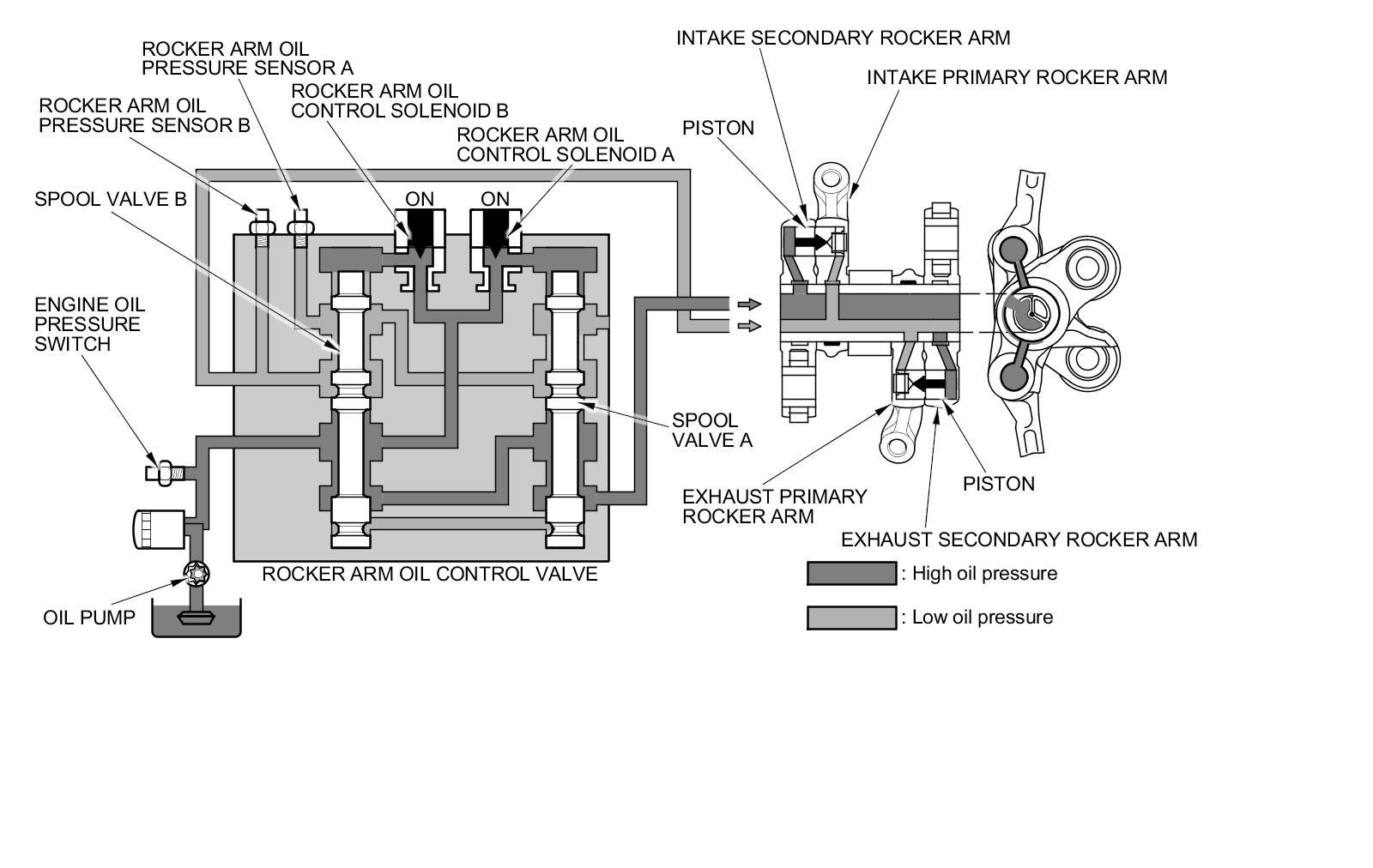 The VTEC system changes intake and exhaust valve lift characteristics (in normal lift and pause modes) to improve fuel economy. Two rocker arm oil control solenoids in the engine oil passage that leads to the intake and exhaust rocker arms controls the intake and the exhaust valve lift. The engine oil pressure is monitored by two rocker arm oil pressure sensors.
