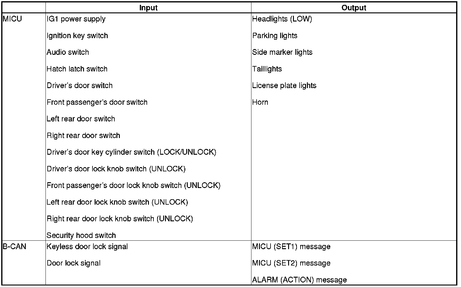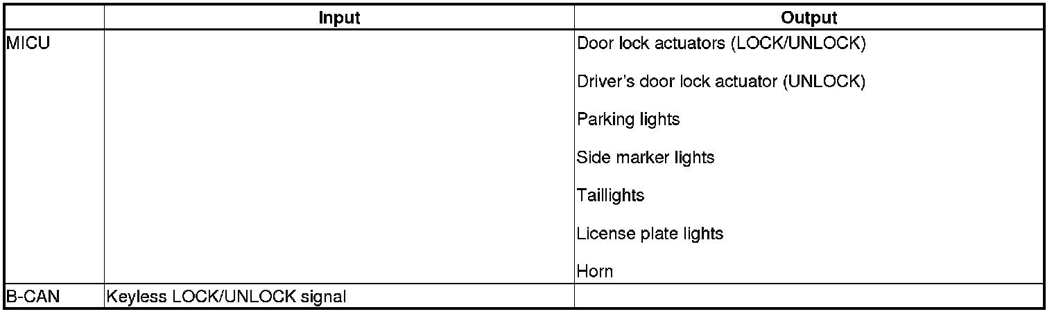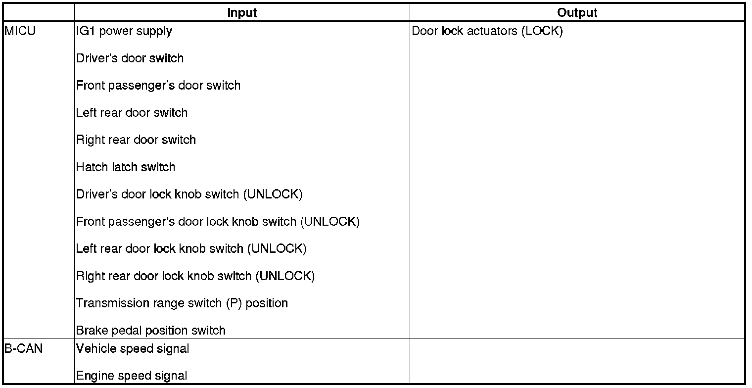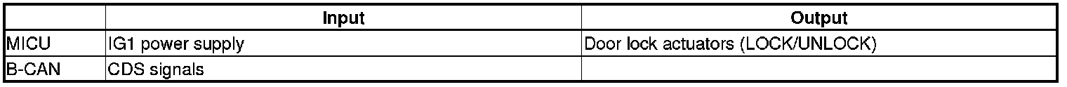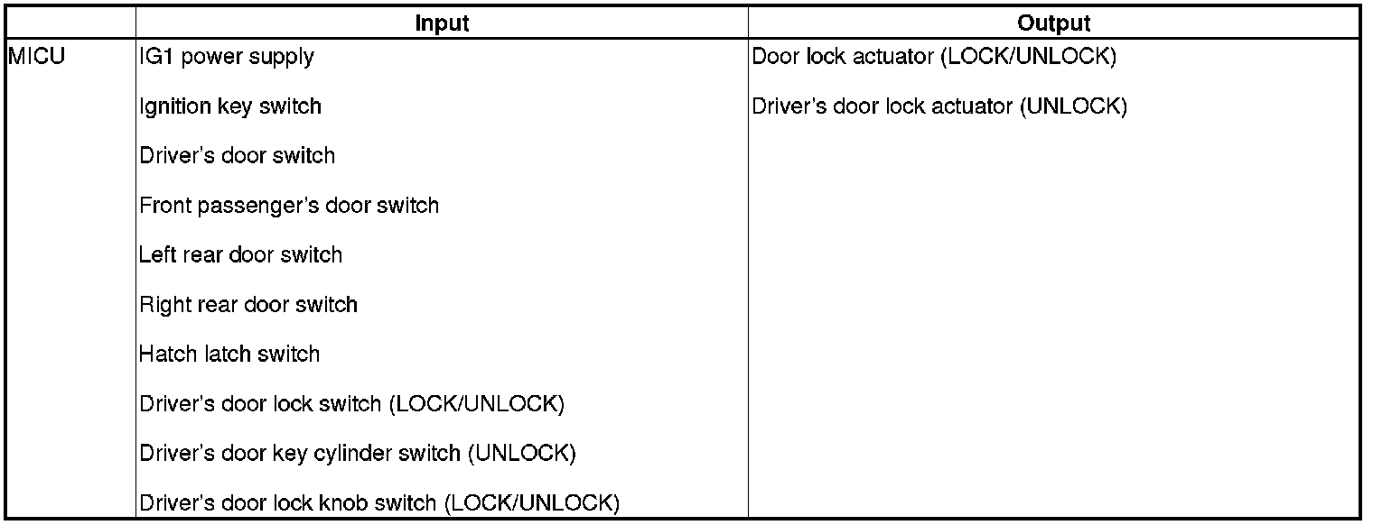 The MICU controls the door lock actuators LOCK, UNLOCK, DRIVER'S UNLOCK, HATCH UNLOCK based on B-CAN door lock switch signals.