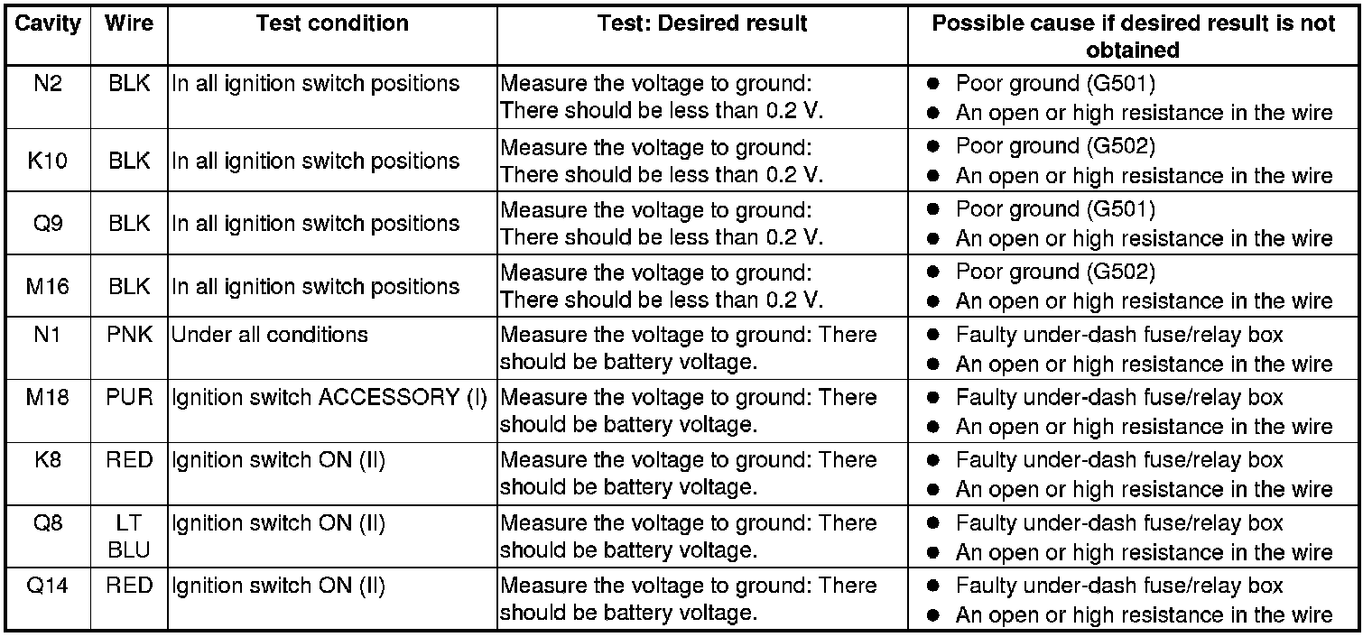 - Before testing, check the No. 1 (15 A), No. 10 (7.5 A), No. 14 (7.5 A), No. 20 (15 A) and No. 22 (7.5 A) fuses in the under-dash fuse/relay box.