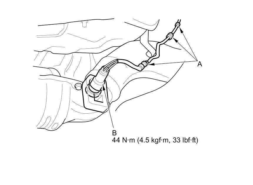 4. Remove the wire clips (A), then remove the secondary HO2S (B).