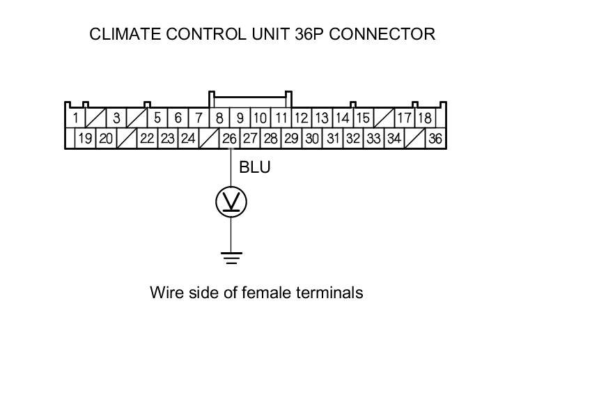 12. Measure the voltage between climate control unit 36P connector terminal No. 26 and body ground.