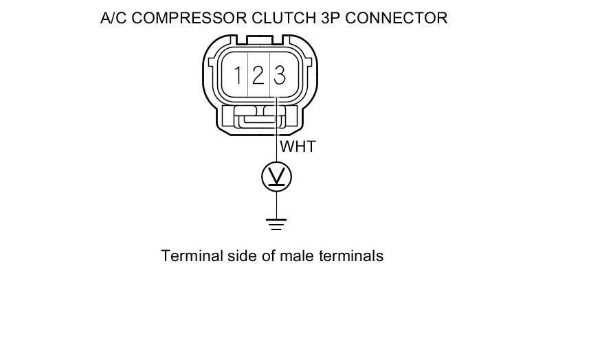 16. Measure the voltage between A/C compressor clutch 3P connector terminal No. 3 and body ground.