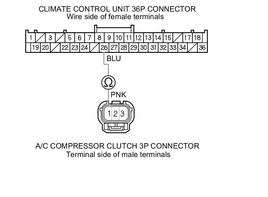 18. Check for continuity between climate control unit 36P connector terminal No. 26 and A/C compressor clutch 3P connector terminal No. 1.