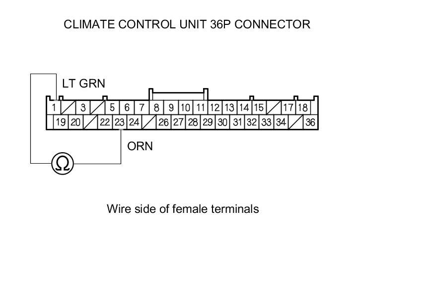 20. Measure the evaporator temperature sensor resistance between climate control unit 36P connector terminals No. 1 and No. 23.