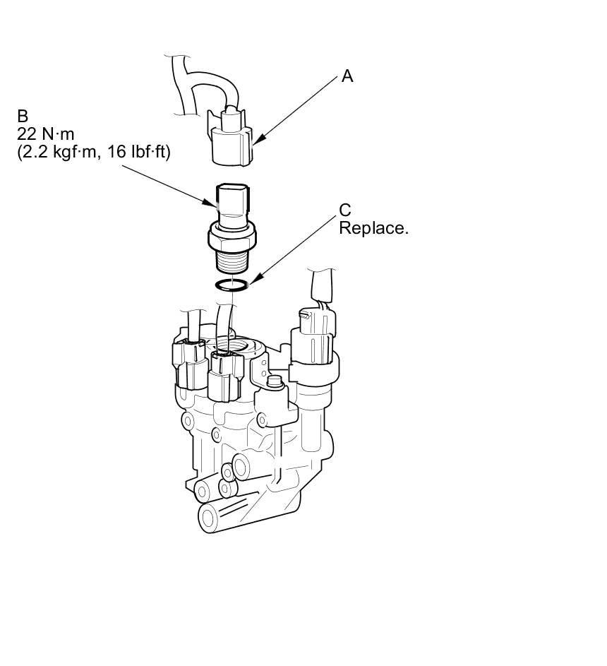 4. Install rocker arm oil pressure sensor B in the reverse order of removal with a new O-ring (C).