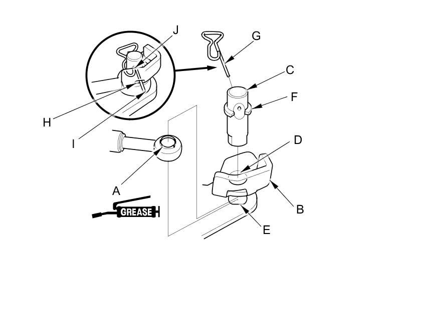 13. Insert the snap pin (G) in the direction shown through the control pin hole and out the opening (H) of the selector control lever so that the hooked end (I) of the snap pin snaps into the countersunk hole (J) of the control pin.