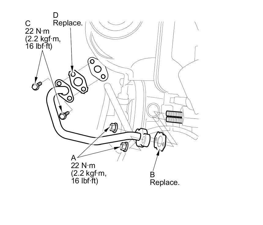 2. Install the EGR pipe to the TWC side, tighten the bolts (C) by hand with a new gasket (D), then torque the bolts.
