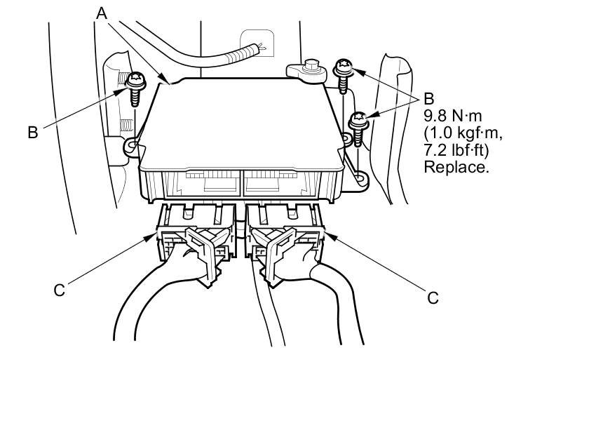 1. Install the SRS unit (A) with new TORX bolts (B), then connect the SRS unit connectors (C) to the SRS unit; push them into position until they click and the lever locks are fully secured.