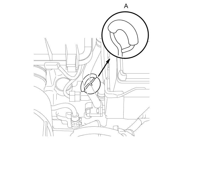 8. If necessary, fill the transmission with CVTF through the dipstick tube opening (A) to bring the fluid level between the upper mark and the lower mark of the dipstick. Do not fill the fluid above the upper mark. Always use Honda CVTF. Using a non-Honda CVTF can affect shift quality.