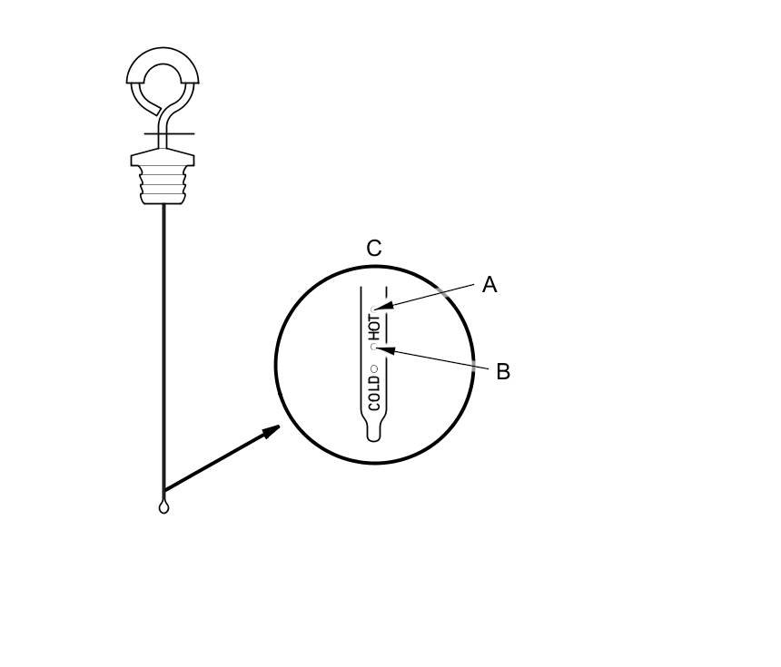 5. Remove the dipstick, and check the CVT fluid level. It should be between the upper mark (A) and the lower mark (B) on the HOT level in tip of the dip stick (C).