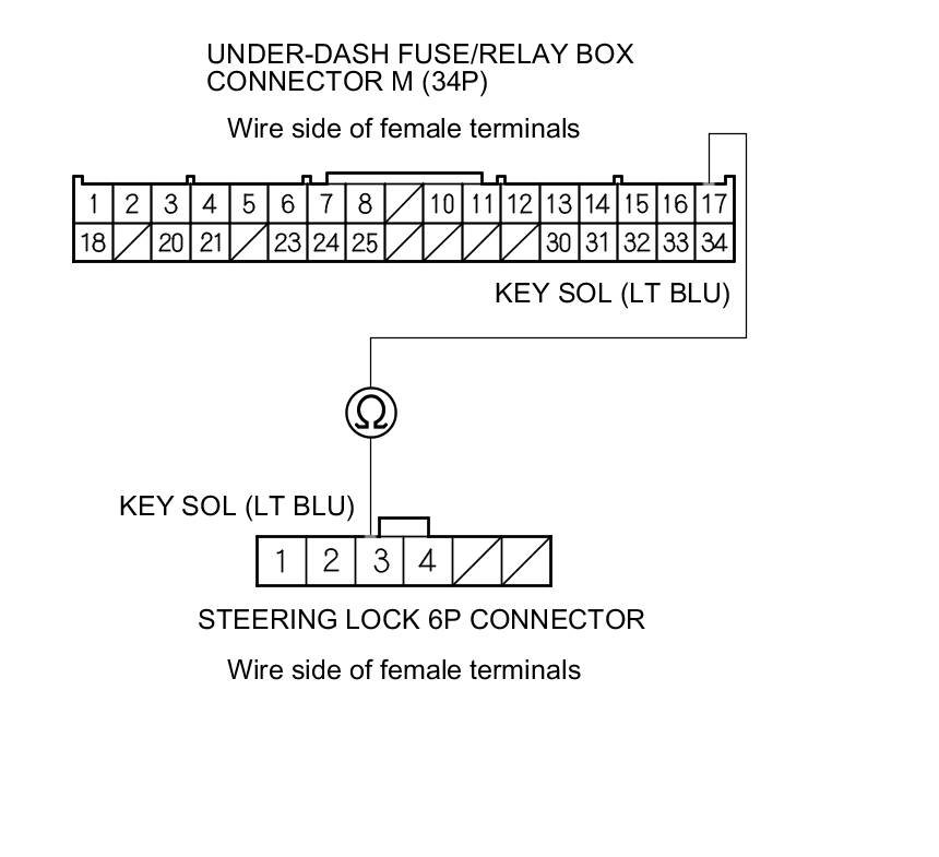 11. Check for continuity between under-dash fuse/relay box connector M (34P) terminal No. 17 and steering lock 6P connector terminal No. 3.