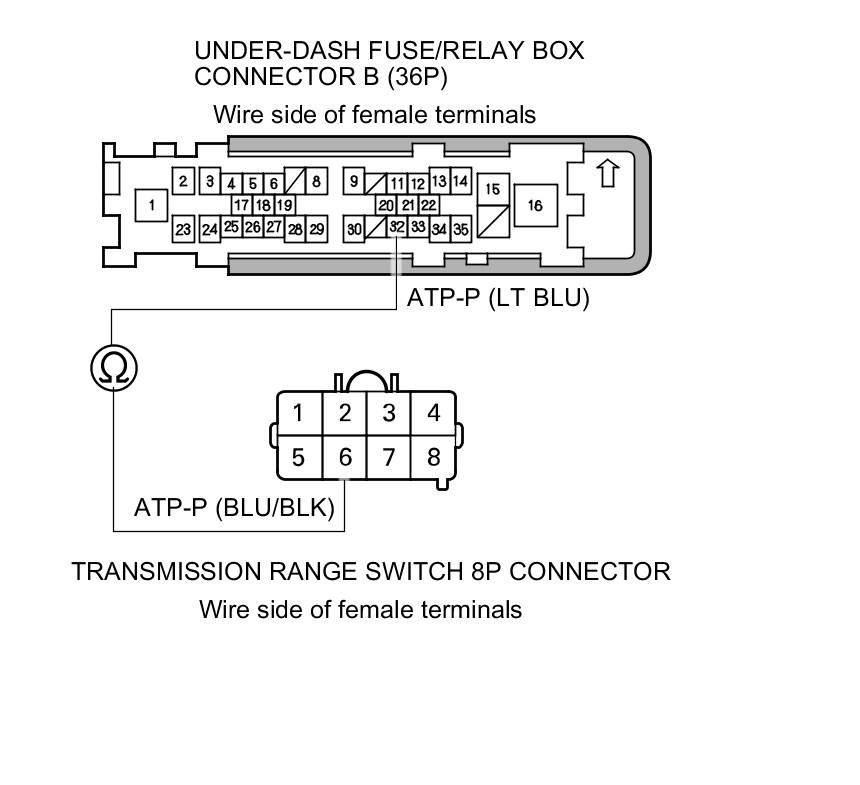 21. Check for continuity between under-dash fuse/relay box connector B (36P) terminal No. 32 and transmission range switch 8P connector terminal No. 6.