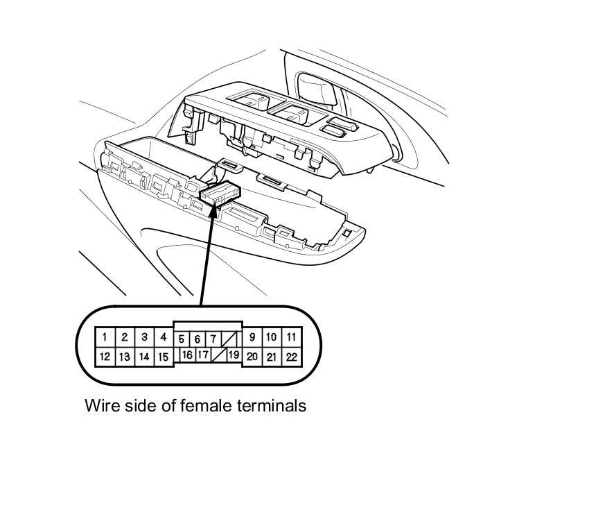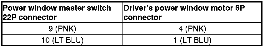 2. Test the motor in each direction by connecting battery power and ground to the power window master switch 22P connector according to the table.
