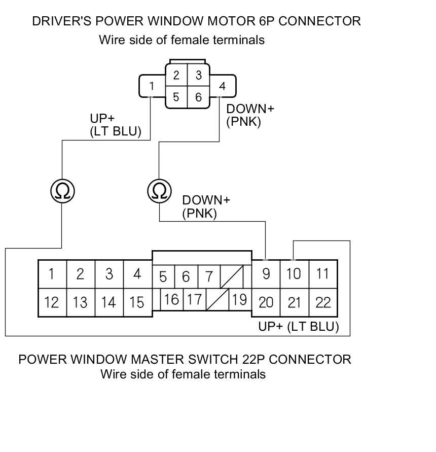 5. Check for continuity between the power window master switch 22P connector terminals and the driver's power window motor 6P connector terminals as shown. There should be continuity.