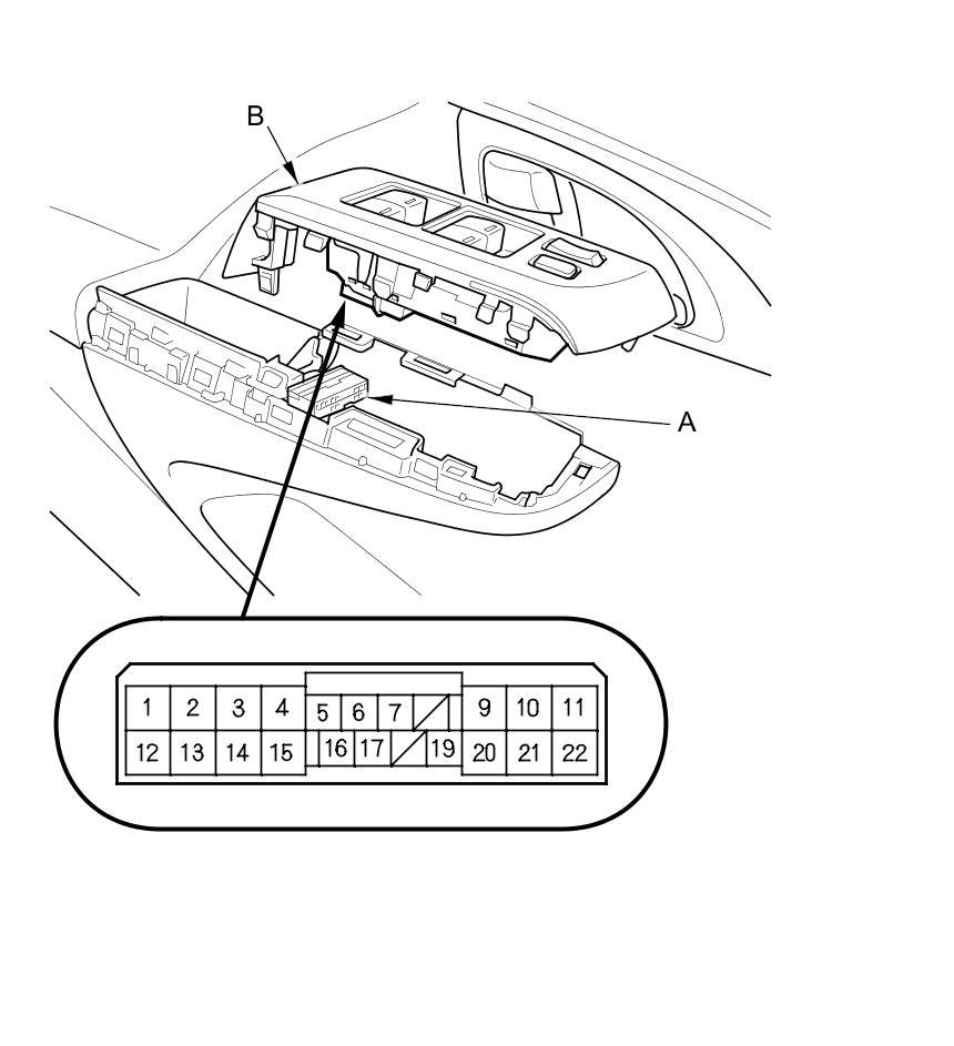 2. Disconnect the 22P connector (A) from the power window master switch (B).