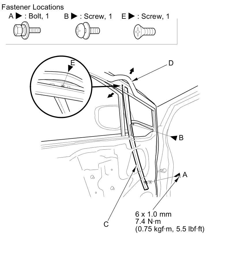 5. Remove the bolt (A) and the screw (B) from the front lower channel (C). Pull the door weatherstrip (D) away as needed, and remove the screw (E).
