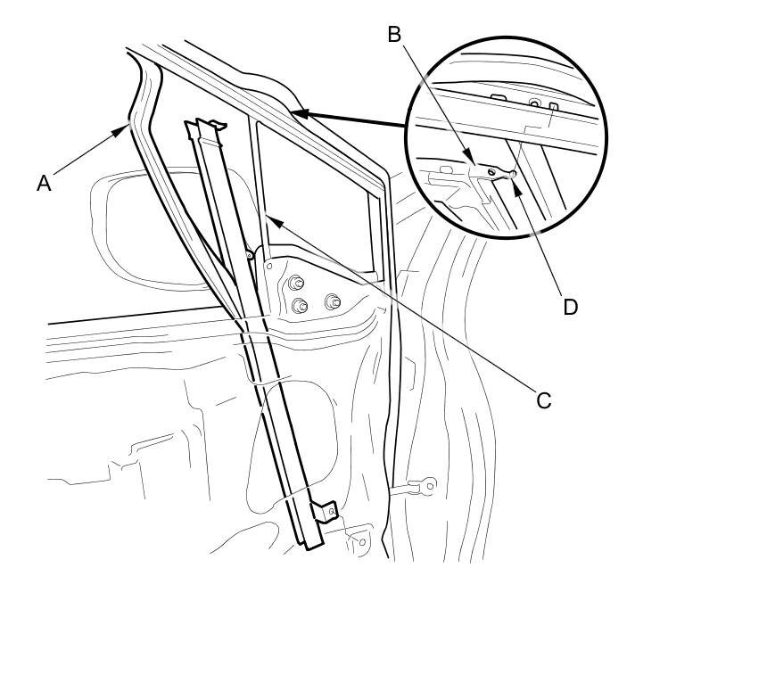 6. Pull the glass run channel (A) away as needed. Pull the front lower channel (B) rearward from the corner glass seal (C), then release the upper hook (D) from the door.