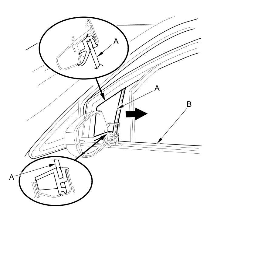 9. Remove the corner glass (A). Take care not to damage the outer weatherstrip (B).