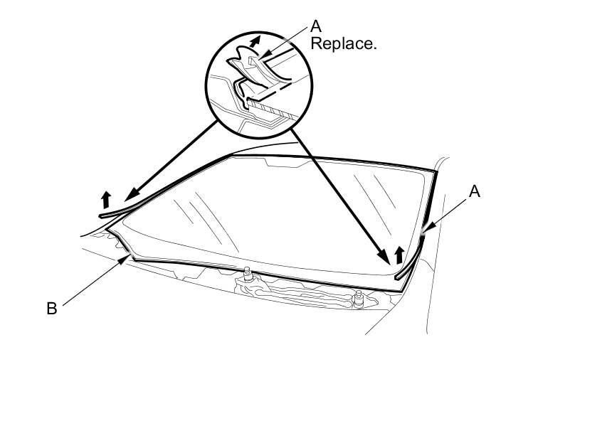 2. Remove the windshield molding (A) from the edge of the windshield (B). If necessary, cut the windshield molding with a utility knife.