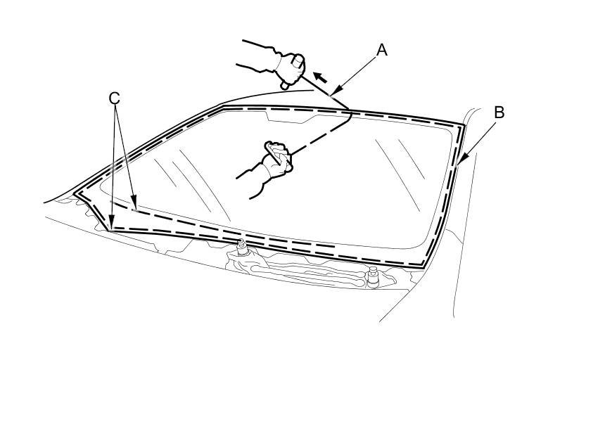 Carefully cut through the rubber dam and the adhesive (C) around the entire windshield.