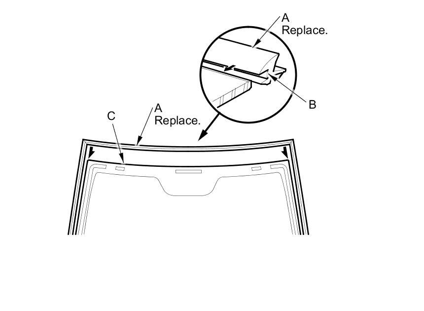 12. Attach a new windshield molding (A) with adhesive tape (B) to the edge of the windshield (C):