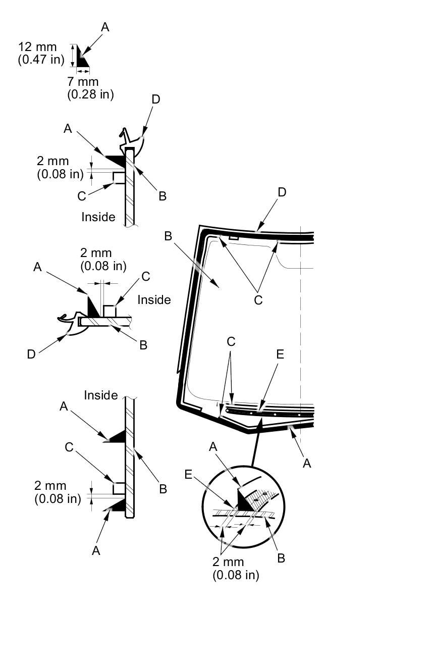 18. Put the cartridge in a caulking gun, and run a continuous bead of adhesive (A) around the windshield (B) along the edge of the rubber dams (C) and the windshield molding (D) as shown: