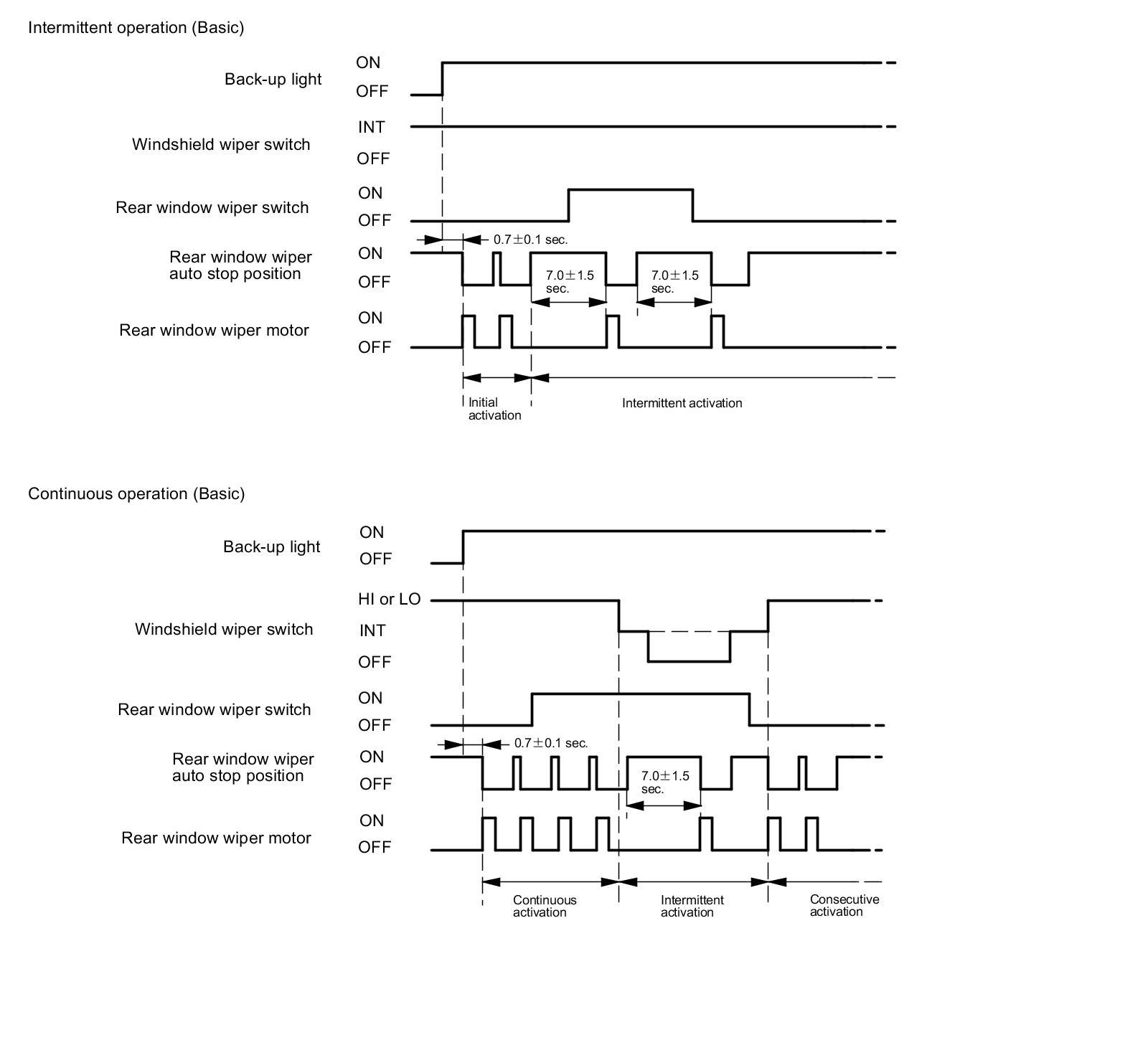 When the shift lever is shifted to R with the windshield wiper activated, the rear window wiper operates automatically even if the rear window wiper switch is off.