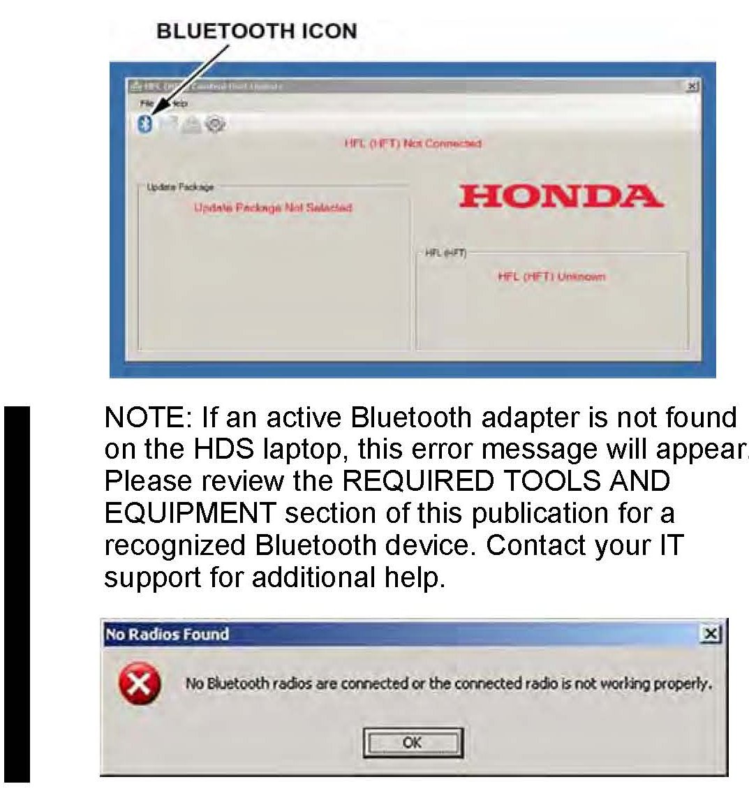 8. In the HFL update tool, click on the Bluetooth icon in the upper left-hand corner of the HFL Control Unit Update screen to prepare the HDS Laptop for the pairing process with the vehicle's HFL control unit.