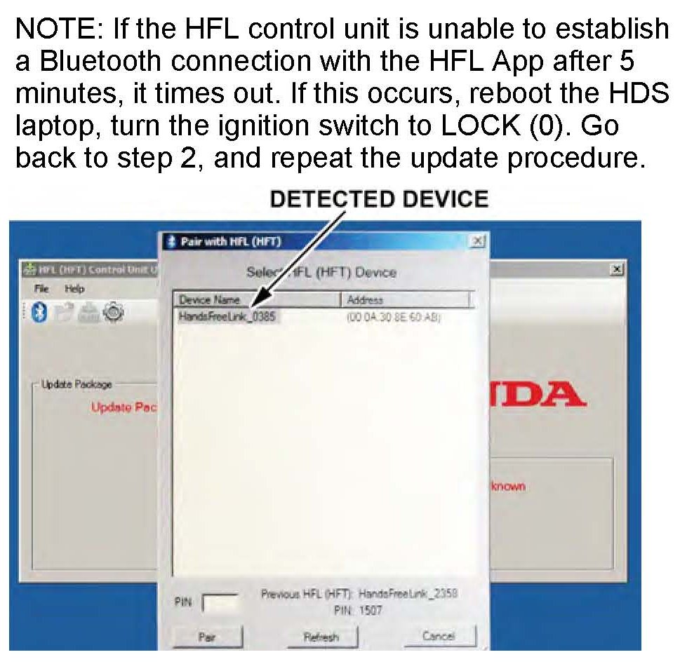 9. In the HFL (HFT) control unit update tool (HFL update tool), the "Pair with HFL" window pops up. Wait a few seconds for the display to show All Detected Bluetooth Devices." If no devices are found after 30 seconds, click on Refresh.