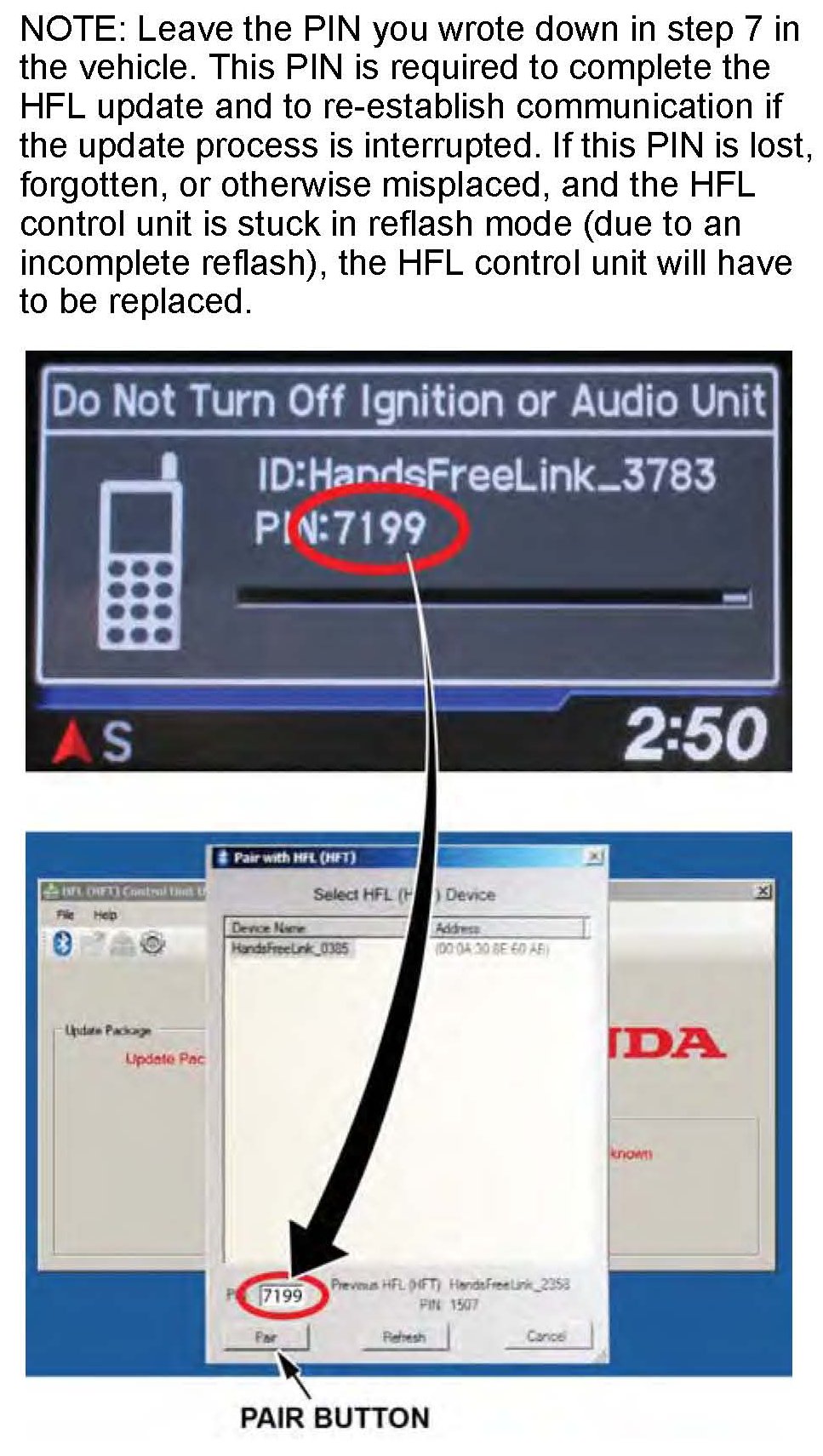 28. In the HFL update tool, enter the original 4-digit PIN you wrote down in step 7 into the lower left corner of the popup window. Click Pair to start the pairing process.