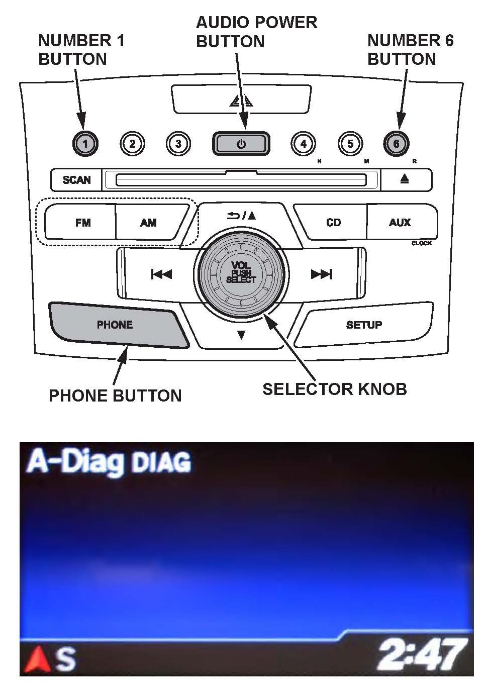 3. Press and hold the audio preset No. 1 button, then press and hold the audio preset No.6 button. Finally, press and hold the audio power button. Release the buttons once the audio unit enters the self-diagnosis mode and the "A-Diag DIAG" screen appears.