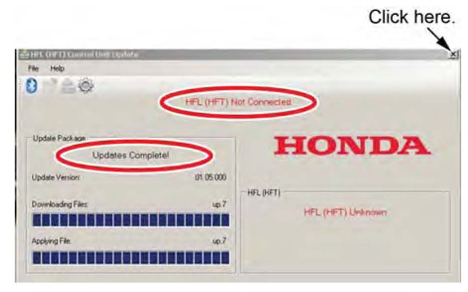 18. The HFL update tool indicates the update is complete, and automatically disconnects the Bluetooth connection from the HFL control unit. Close the HFL update tool by clicking on the "X" in the upper right-hand corner.