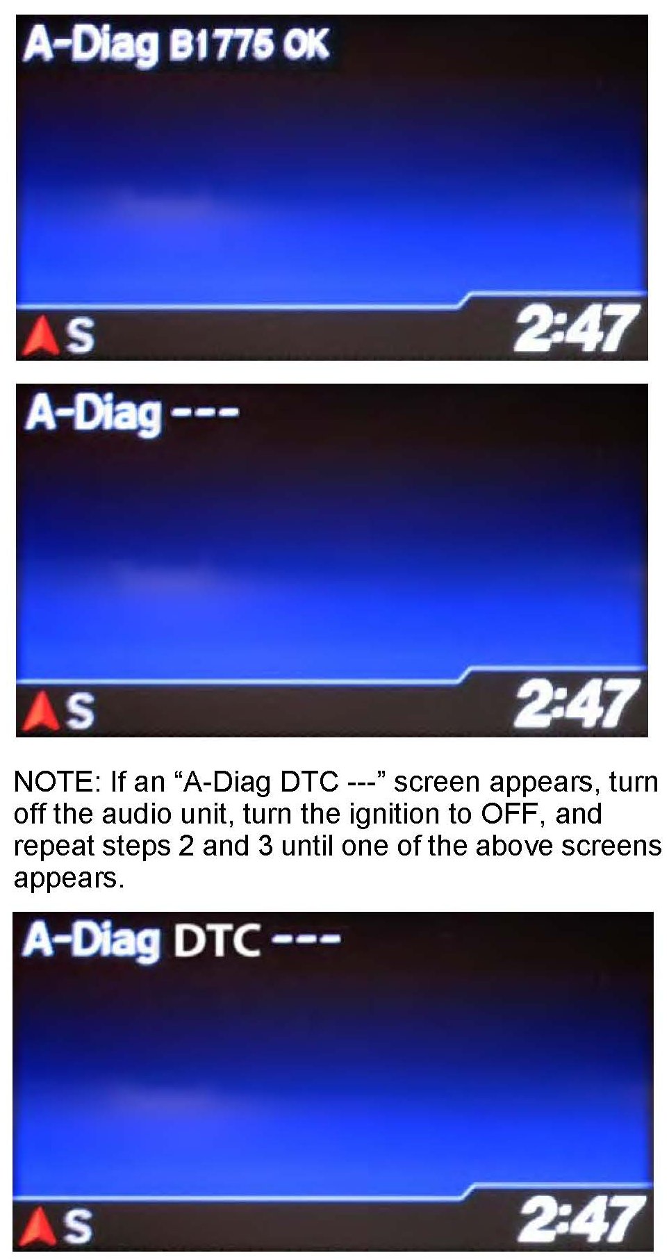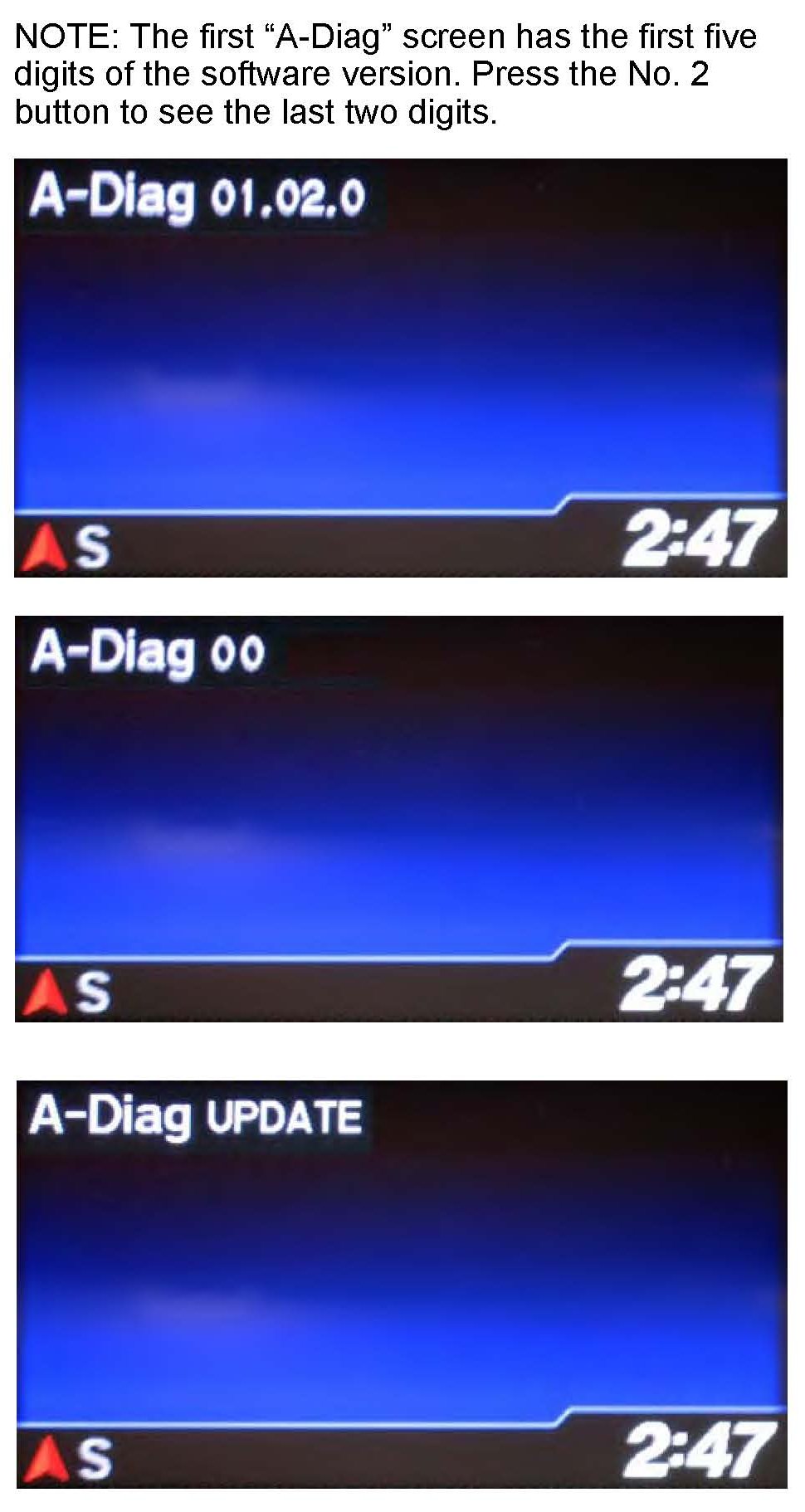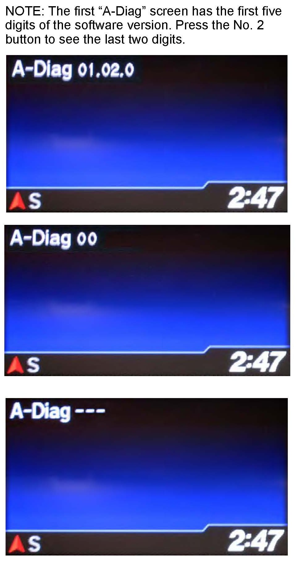5. Press the audio preset No. 2 button several times to cycle through the display screens until you see the A-Diag XX.XX.XXX" screen. Verify that the correct software version is installed.