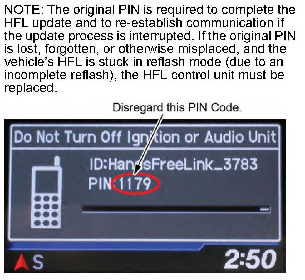 24. Press the selector knob on the audio unit to change the HFL update screen. A different PIN code is displayed; ignore it. You'll use the PIN you wrote down in step 7.