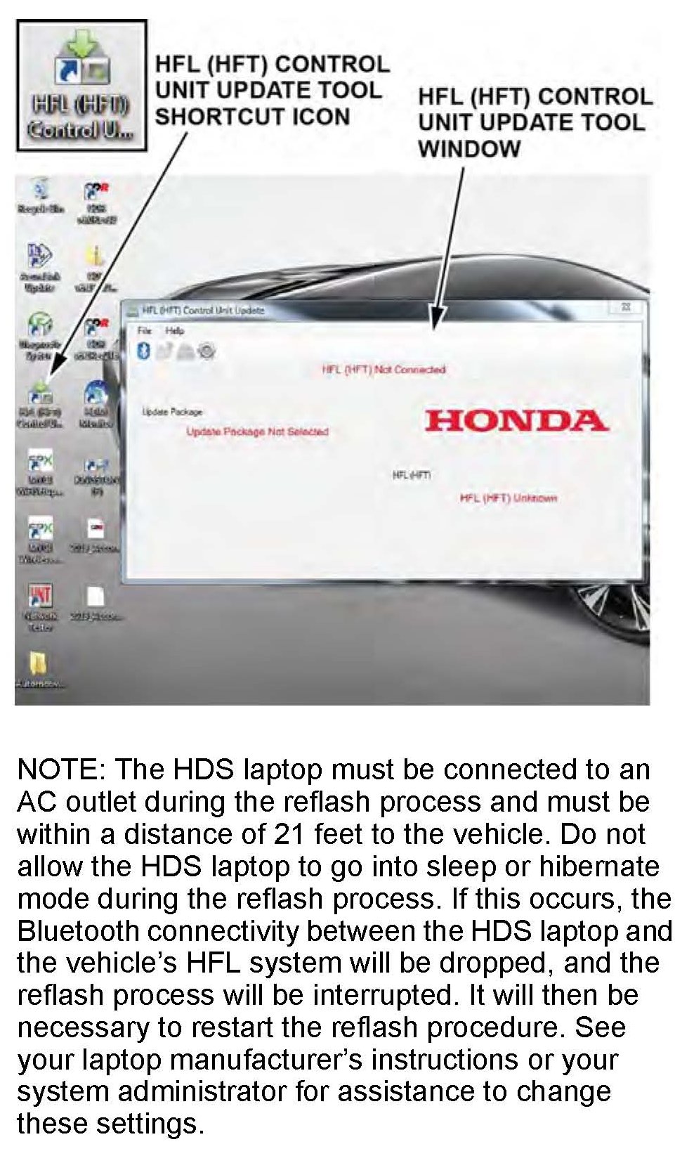 6. On the HDS laptop, double-click the HFL Control Unit Update icon to launch the Honda HFL (HFT) Control Unit Update Tool (HFL update tool).