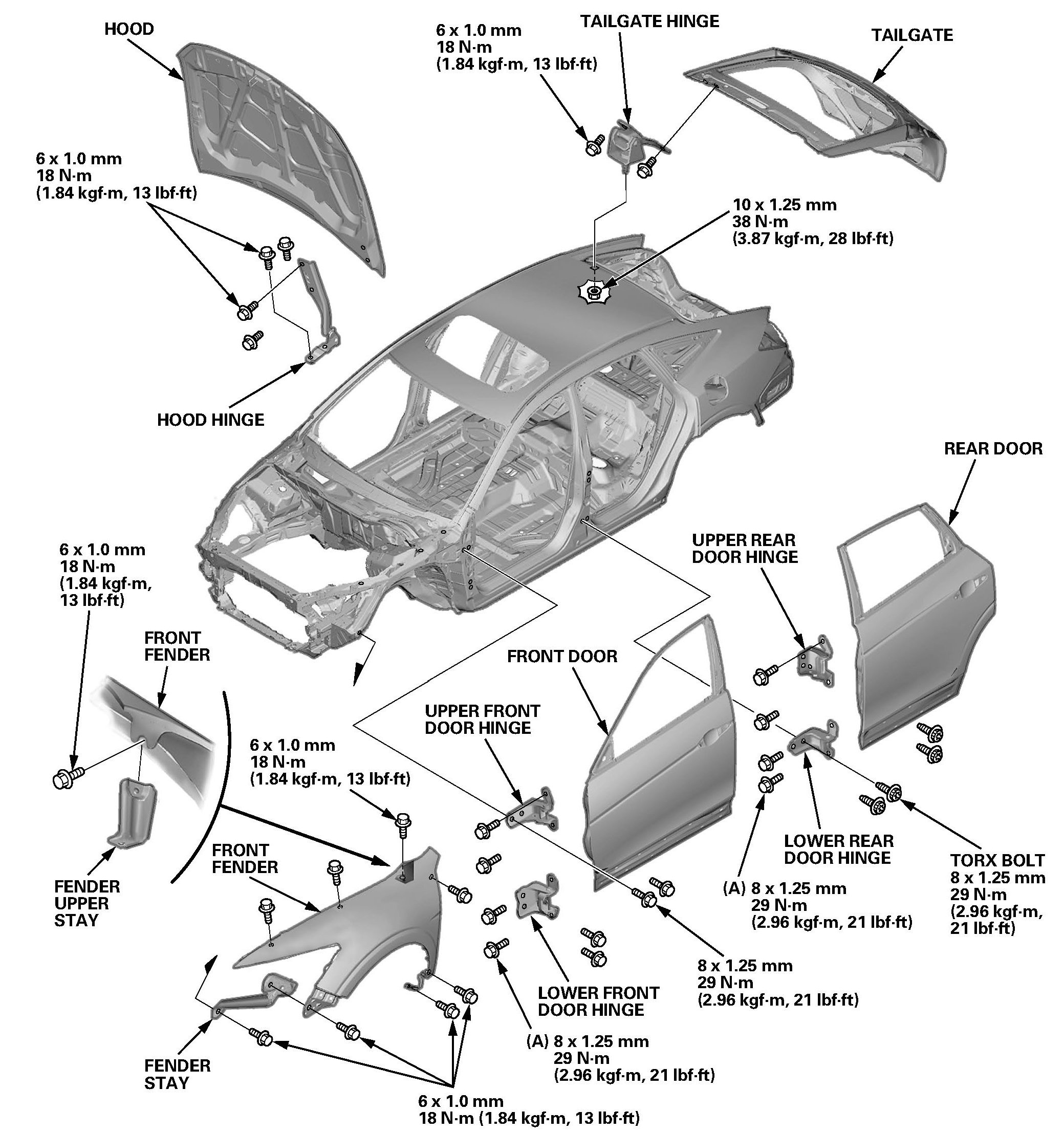 - Check the hood, the doors, and the tailgate positions, refer to the external parts fitting position.