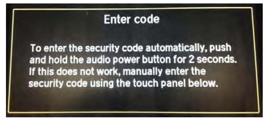 3. start the engine, and drive the vehicle outside away from buildings, tall trees, and power lines. Press the audio-navigation power button to turn on the audio- navigation unit. When the Enter code screen appears on the audio-navigation display, press and hold the audio power button for about 2 seconds to allow the PCM to verify that the vehicle's VIN matches the VIN saved in the audio-navigation unit. You'll hear a long beep when the audio-navigation unit exits the anti-theft mode. Release the power button.