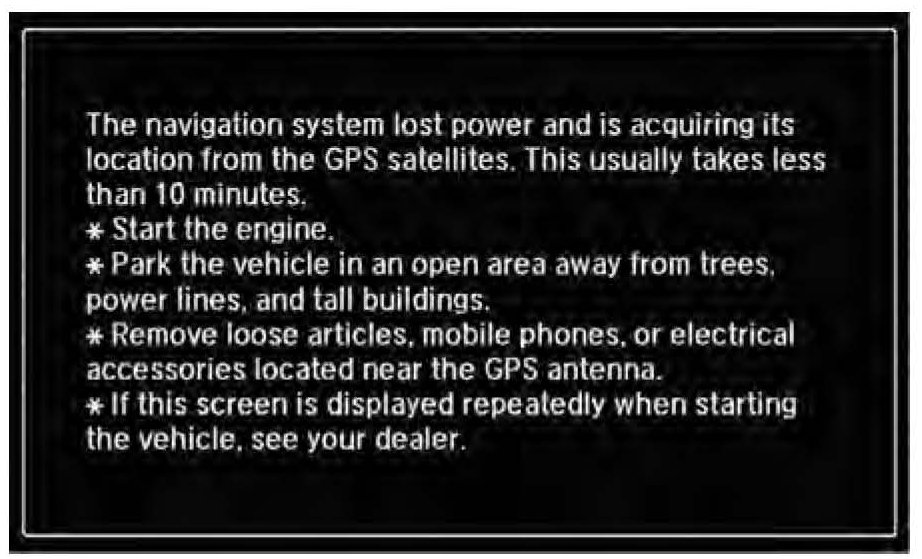 5. The instructions below appear on the screen to indicate that the system is initializing (determining its location from the GPS satellites). Follow the on-screen instructions.