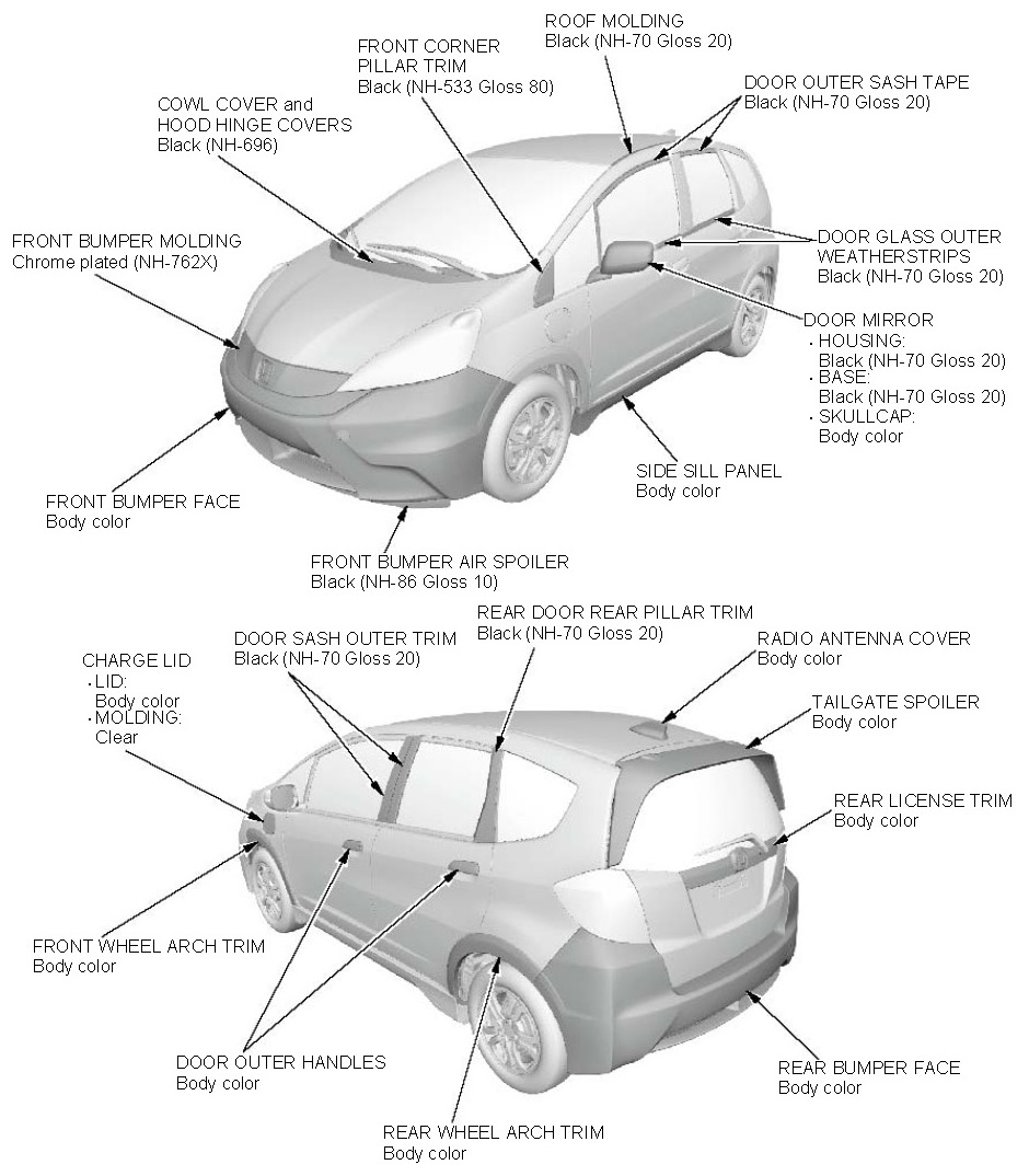 - Apply black paint to the visible surfaces of the front bulkhead, the front damper housing, the rear wheelhouse, and the left wheelhouse upper member (inside of the charge lid) after repairing and painting.